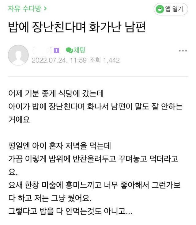아이가 밥에 장난친다며 화내는 남편