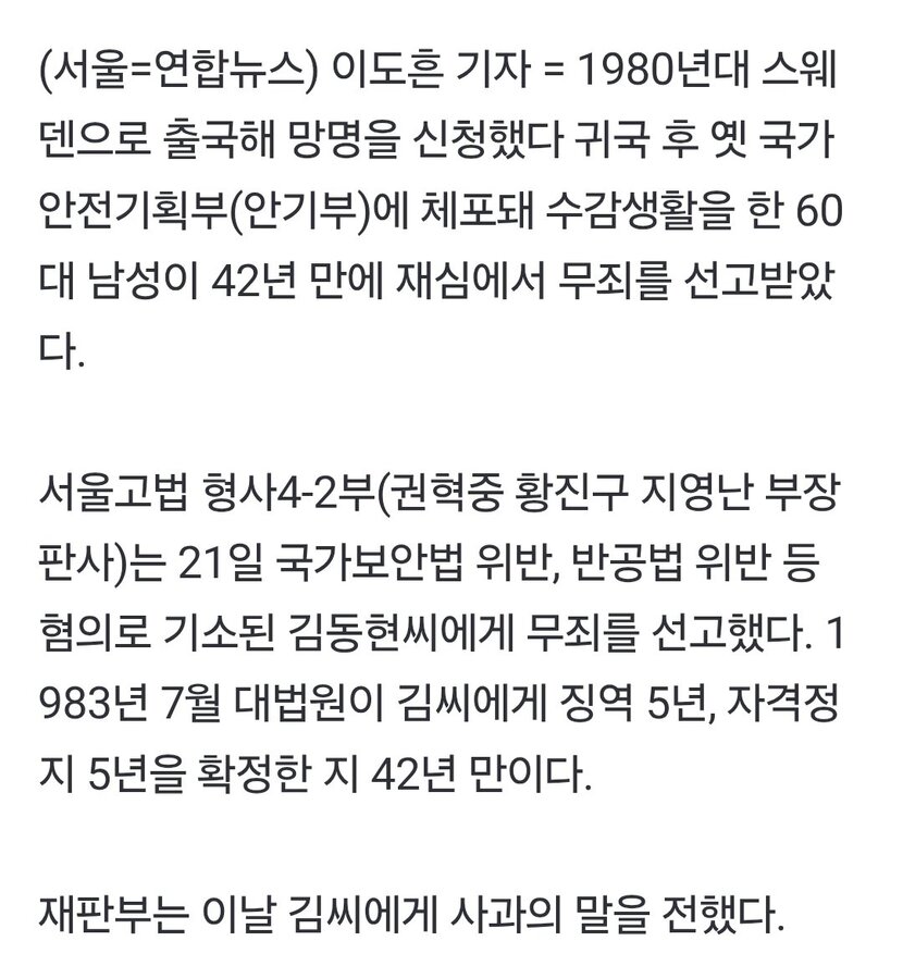 안기부 고문끝 허위자백 42년만 무죄