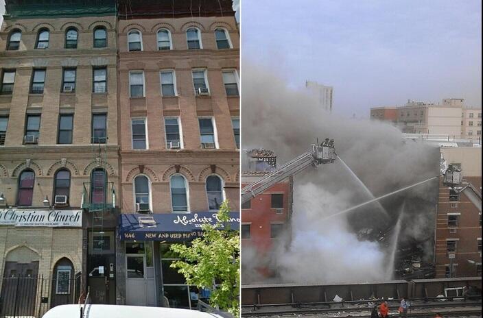 위 사진은 폭발로 붕괴된 뉴욕의 이스트할렘 빌딩의 사고 전후의 모습입니다.